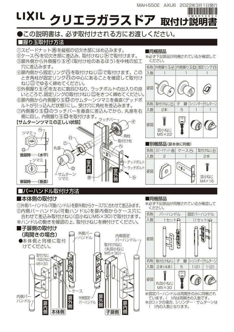 ●ドア枠、握り玉、バーハンドル、押し板、鍵(シリンダー)、ドアクローザーは現場にてセットするようお願いします。