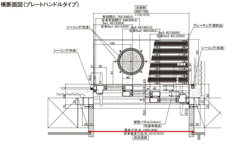 浴室引戸 アルミサッシ ドア本体3枚・枠セット 浴室用 LIXIL リクシル トステム TOSTEM リフォーム DIY 送料無料 浴室3枚引戸 プレートハンドル 1220 W1212 × H2000 浴室引戸 風呂扉 LIXIL リクシル トステム