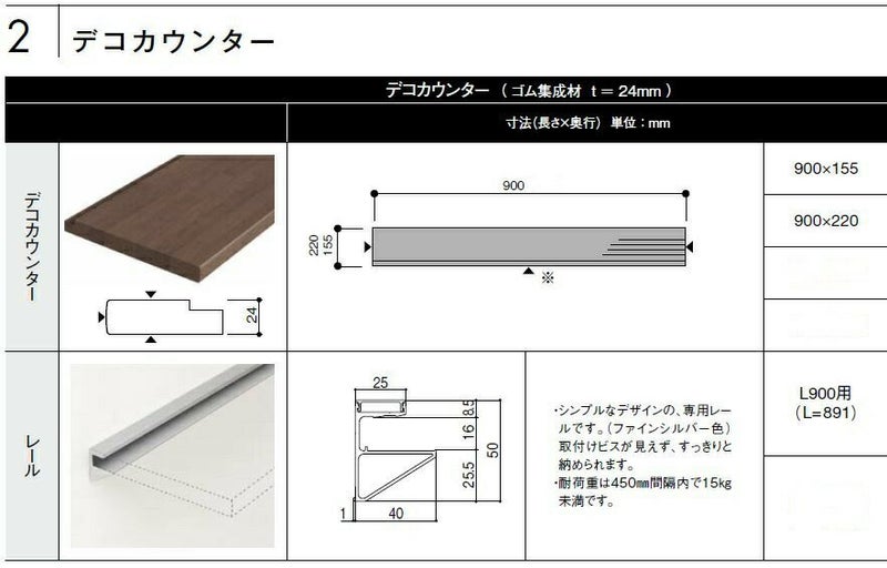 カウンターサイズ:長さ900 mm x 奥行 155 mm、幅 24mm